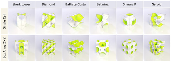 In the second step, the minimal surfaces can be generated to create the internal geometry of the brick with walls thickness of about 0.8 cm. In particular, six minimal surfaces are investigated by considering some of the most used surfaces in digital manufacturing [32,33,34]: Gyroid [28], Shwarz Primitive [28], Shoen’s Batwing [35], Battista-Costa [36,37], Diamond [29], Sherk tower [38].