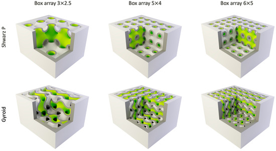 Different configurations of the 3D bricks: three different box arrays for the Shwarz P and Gyroid minimal surfaces.