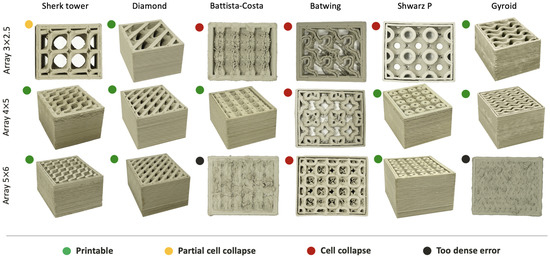 Figure 8 shows the 18 3D-printed bricks (with different internal geometries) and the printing result in terms of too dense error, collapse, partial cell collapse, perfectly printable.
