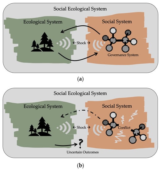 The shock to the social system can be triggered from within, or from the outside. Outside shocks can come from a different social system or from the material environment [28]. If a social system is in shock for a while, its environmental governance is likely to break down, which will cause damage to its environment [29,30,31]. Environmental disruptions can thus cause social disruptions and vice versa, as we knew since Aristotle. We can speak of social-ecological shocks when disruption takes place in both social and ecological systems, and in their coupling. Coordination of actions affecting the environment breaks down, while coordination of responses to environmental change suffers a similar fate [29,30,31,32] (Figure 1).