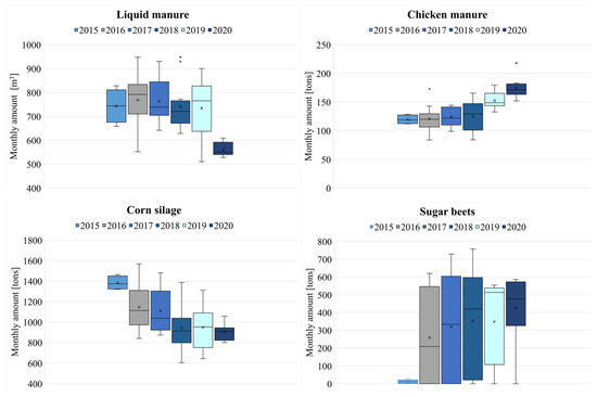 During the mentioned operation period, the biogas plant was fed daily with liquid manure, chicken dung, and maize silage, and was provided seasonally with sugar beet. The range of average monthly liquid manure fed to the biogas plant was between 510 and 948 m3, with an average value of 725 ± 113.2 m3. The monthly amount of chicken dung feed was in the range of 84–218 tons, with an average of 136 ± 27.1 tons. The monthly amount of maize silage fed to the biogas plant was in the range of 606–1568 tons, with an average of 1041 ± 227.2 tons. The fourth substrate, which was used seasonally in feeding the biogas plant, was sugar beet. Figure 2 summarizes the monthly quantity of the substrates fed to the biogas plant.