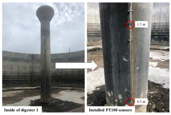 Due to the sedimentation in digester 1 during approximately eight years of operation, digester 1 was emptied and cleaned in August–September 2019. As a result, temperature sensors were installed inside the first digester to examine the temperature distribution inside the digester at different heights. As represented in Figure 3, PT100 sensors were installed on the concrete column in the middle of the digester at different heights; 0.5, 1.5, 2.5, 3.5, and 4.5 m. PT100 thermometers were calibrated before the usage, and used to perform temperature measurements at the biogas plant during period 3 (see Figure 3). The operation time of the stirrers was as follows: the hydro mixer was under operation after each feeding (every one hour) 12 min on/48 min off, and two propellers were running for 10 min on and 30 min off.
