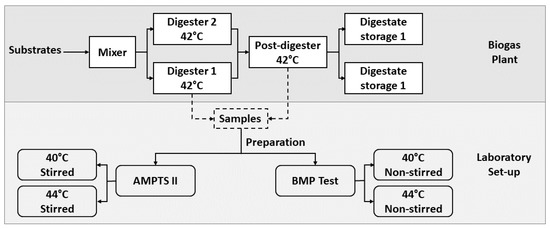 In order to determine the biomethane potential of the digestate samples from industrial-scale biogas plants at different temperatures and stirring conditions, laboratory analyses were performed in two separate batches: