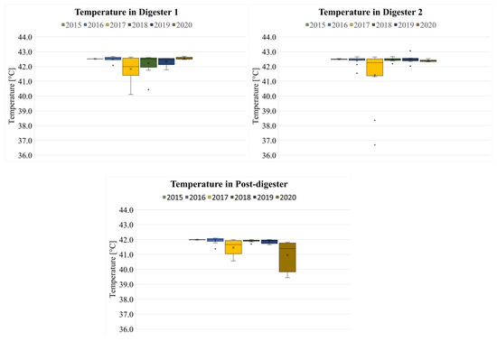 The chosen temperature to operate the biogas plant was 42.0 °C. Nevertheless, there were some variations in the temperature, as can be seen in Figure 5. As a summary of the temperatures inside the digesters and post-digester: