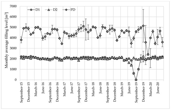 Average filling levels of digester 1 (D1), digester 2 (D2), and the post-digester (PD).