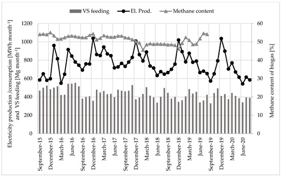 Monthly total VS feeding, electricity production, and average methane content of biogas during 2015–2020.