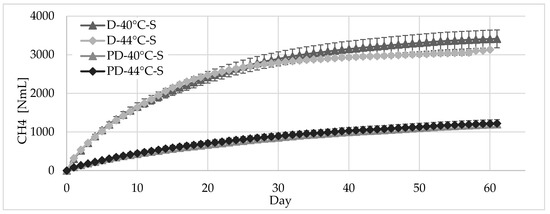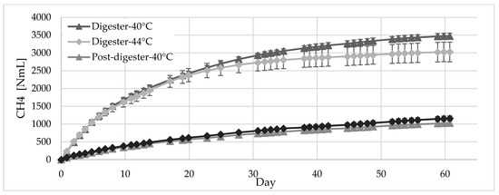 The biomethane generation results were obtained from AMPTS II test system software as the dry gas amount in NmL, and the cumulative biomethane production is represented in Figure 8. From the beginning of the test until day 25, the same amount of biomethane was obtained from the samples at different temperatures. After day 25, the methane generation varied for the samples from the digester at different temperatures. At the end of the experiment, a higher amount of biomethane was obtained at 40 °C. The cumulative biomethane produced from the samples from the digesters at the temperature of 40 °C were 10% higher than those at the temperature of 44 °C, having the value of 188.62 NmL CH4 g VS−1. In contrast, the results for the post-digester showed similarities for the different temperatures. The specific biomethane generation (NmL CH4 g VS−1) obtained from the digester samples was 188.62 ± 0.41 NmL CH4 g VS−1 at 40 °C and 170.48 ± 4.21 NmL CH4 g VS−1 at 44 °C, and from the post-digester samples the generation was 50.31 ± 2.43 NmL CH4 g VS−1 at 40 °C and 51.71 ± 3.69 at 44 °C.