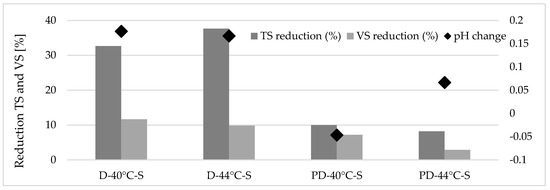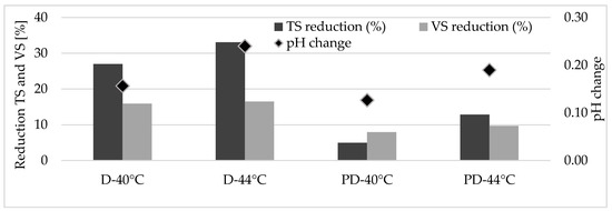 For the samples from the digester, the reduction in the TS was higher at 44 °C than for the samples at 44 °C, whereas the VS reduction showed similarities. For the samples from the post-digester, the decrease in TS and VS values showed a small increase for the samples at 40 °C in comparison with the samples at 44 °C (see Figure 9). The pH measurements before and after the test showed that there was an increase in each reactor, with the exception of the post-digester samples at 40 °C.