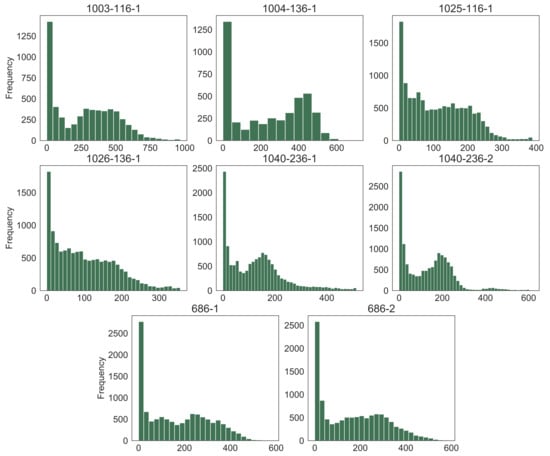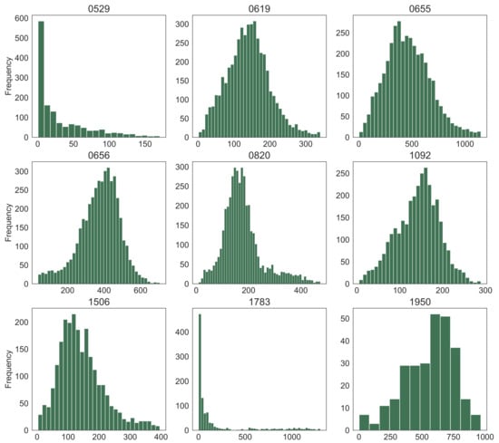 The count distributions of matching Telraam sensors are presented in Figure 1. Shown distributions are aggregated measures in both directions, so we subsequently separated the data for each direction, as explained in Section 3.3. Devices 0619, 0655, 0656, 0820, 1029, and 1506 are matched with ILCs as declared in Table 1. Additionally, three anomalous distributions are displayed, to show unsuitable characteristics, for which we excluded these examples from further analysis. Right-skewed distributions from counters 0529 and 1783 indicate unreliable operation, while the low frequency of counts at sensor 1950 exhibits its recurrent inactivity.