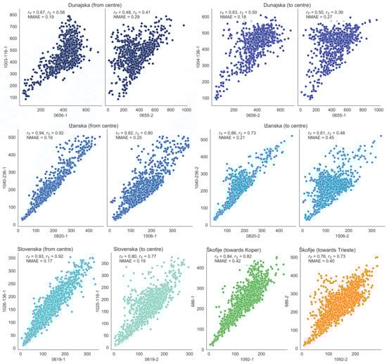 Correlations between inductive loop counters (y axes) and Telraam counters (x axes). Different colours indicate different road segments. Symbols and abbreviations: —Pearson’s correlation coefficient; —Spearman’s correlation coefficient; —normalised mean absolute error.
