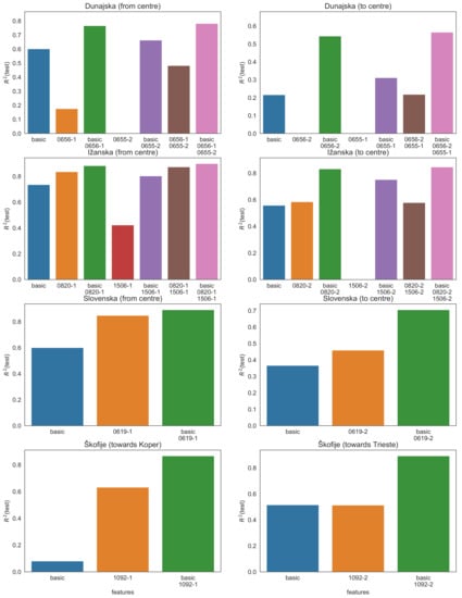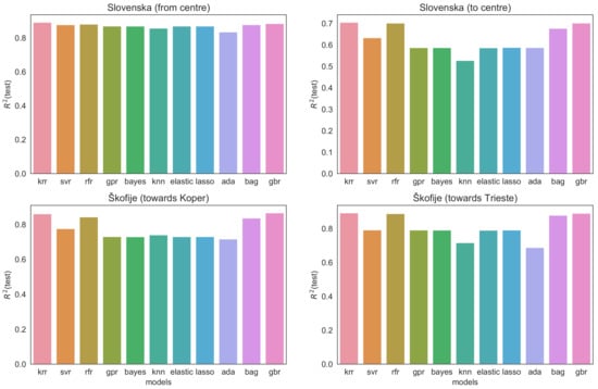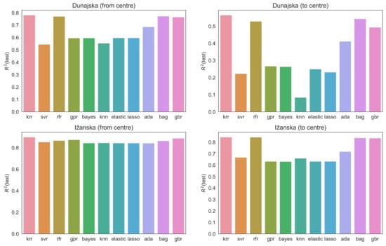 For each analysed segment, we established several regression models which predicted the values of the dependent variable based on independent variables. We tested how well each model fits the observed data by calculating the respective coefficients of determination (). In most cases, all models performed well and produced similar values (see Figure 5). This can be seen especially in segments Ižanska (from centre) and Slovenska (from centre), where all 11 models presented values above , indicating a good fit. On the other hand, the models for segment Dunajska (to centre) showed substantially distinct relative performance. Overall, the best model with the highest was consistently the kernel ridge regression, winning in all cases but one (see Table 2). However, as evident from Figure 5, random forest regression, bagging, and gradient boost regression had a very similar scores as kernel ridge regression in most cases.