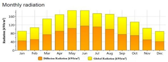 The monthly radiation data of proposed site is shown in Figure 2. From the figure it is shown that during the summer season of the year, the radiation level is highest especially for months of May and June. The average annual global horizontal irradiation (GHI) is 1722.0 kWh/m2 and horizontal diffuse irradiation is 932 kWh/m2 at the proposed site. GHI is total solar irradiation incident on the horizontal surface.