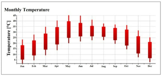 Monthly temperature data of proposed site is shown in Figure 3. From the figure it is shown that the air temperature of the site are increases during summer season and decreases during winter season. The monthly average air temperature is 24.0 °C as shown in Figure 3. This data indicates that there is an ample amount of reliable solar energy available that is harnessed by a photovoltaic energy generation system.