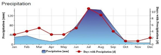 Precipitation data of proposed site are shown in Figure 4. The precipitation is generally high in all months of summer and it is low for winters except March. The monsoon season lasts from May to September and reaches its peak in July and August, about 65.0–70.0% of the annual rainfall.
