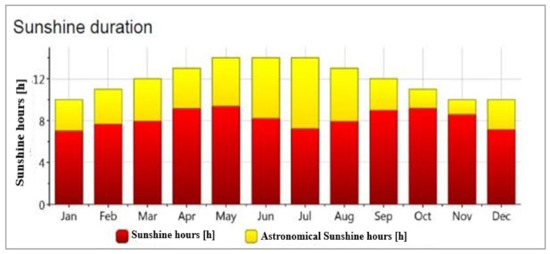 Sunshine hours of the proposed site are shown in Figure 5. The number of sunshine hours are important to understand the how much irradiance is required to produce the required output power. This parameter allows us to understand the maximum number of sunshine hours that proposed site will receive. Throughout the year, the sunshine hours vary from 7.0 to 13.0 h.