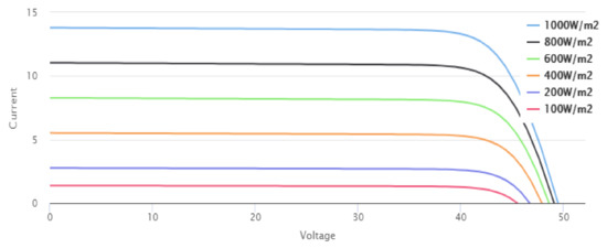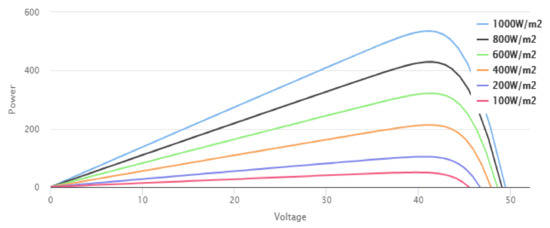 Photovoltaic module performances at different irradiance levels are shown in Table 4. The current–voltage curve of photovoltaic module in Figure 6 shows the simulation result for current (I) versus voltage (V) characteristics of the photovoltaic modules at different irradiance level (i.e., irradiance 1000 W/m2, irradiance 800 W/m2, irradiance 600 W/m2, irradiance 400 W/m2, irradiance 200 W/m2, and irradiance 100 W/m2). The current–voltage curve shows that as the radiation intensity level increases, the short-circuit current (ISC) of the PV modules increases. Similarly, the power–voltage curve of photovoltaic module in Figure 7 demonstrates power versus voltage characteristics at various levels of irradiance. The results show that as the radiation intensity level increases, the maximum power output of the photovoltaic modules also increases.
