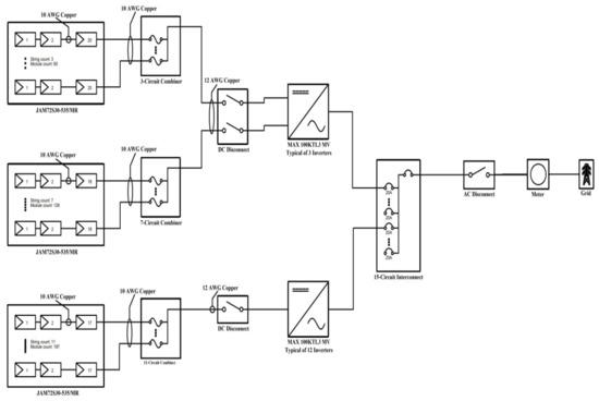 The layout design and single line diagram of the PV system is shown in Figure 8 and Figure 9, respectively. From SLD, we shown that 11 strings are connected to inverter (MAX 1000 KTL) and each string contain 17 PV modules. This configuration is used for 14 inverters. With inverter No. 15, 10 strings are connected (3 strings contain 20 PV modules and 7 strings contain 18 PV modules). Wiring configuration is very important for effective system installation, as it can reduce the system loss and improve the operational safety of the system. PV modules are connected in strings with 10 AWG DC cable. These strings are combined in combiner box. From combiner box to inverter we used a 12 AWG DC cable.