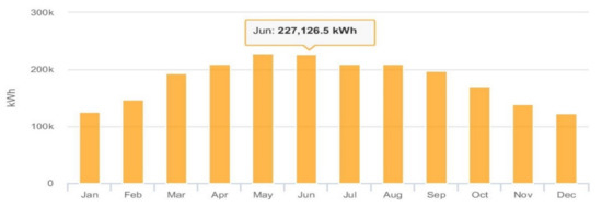 From simulation result of all cases, we concluded that the PV system installed at 15° angle are more efficient than the PV system installed at other tilt angle, because total collector irradiance is maximum (1725.0 kWh/m2) at 15° tilt angle as shown in Figure 21 and performance ratio of the photovoltaic system is also higher. In addition, at this tilt angle, the PV system produces maximum annual output energy (2,264,509.0 kWh).