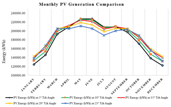 Monthly PV energy (kWh) generation comparison at different tilt angle.