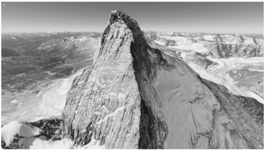 It lets a person immersed in VR visit innumerable places on all continents. Visiting the selected corners of our planet, one can see from various perspectives. The software and goggles serving VR make it possible to see a bird’s-eye view of the world, as well as observe it from the ground thanks to millions of spherical photographs produced in 360° format [6]. Due to the Google Earth app, we can admire the Colosseum from every side (Figure 1) and, after a moment, find ourselves over Hoover Dam on the Colorado River (Figure 2), or the summit of the Matterhorn (4478 m) in the Pennine Alps (Figure 3).