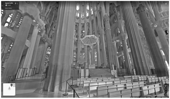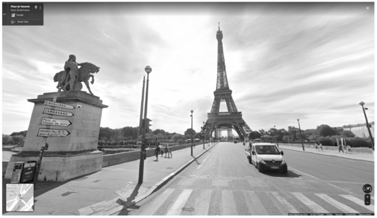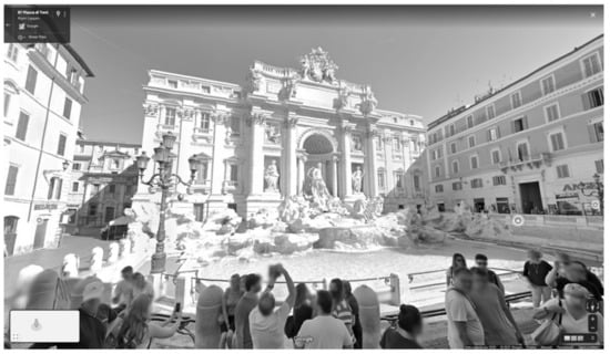 Moving around this world, we can freely look upwards and downwards, get closer to the objects observed or step backward [34,35]. Each walk in the world of Google Street View can also be done with the use of VR goggles. Google Street View makes it possible to admire the Eifel Tower, inter alia, from Place De Varsovie in Paris (Figure 4), to be close to the Trevi Fountain in Rome and, regardless of the name “Street View”, to observe the interior of the Basilica de la Sagrada Familia in Barcelona (Figure 6).