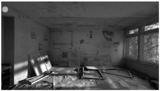 The Chernobyl VR Project is an interesting application using VR that constitutes a combination of the world of computer games, the world of educational applications, and a film narrative [42]. The app makes it possible to move around the abandoned ruined flats of Prypeć (Figure 8), closely observe the No 4 reactor in the Chernobyl Nuclear Power Plant (Figure 9), or climb the over-the-horizon radar called the Eye of Moscow, which is not far from the Chernobyl reactor (Figure 10). This is an interactive story about the tragic fate of the people and the site directly hit by the Chernobyl disaster [6].