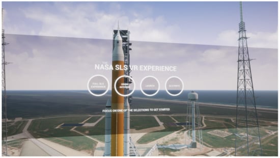 - The NASA SLS VR Experience. Available online: https://www.vrexplorer.net/THE-NASA-SLS-VR-EXPERIENCE/101770 (accessed on 10 November 2021).