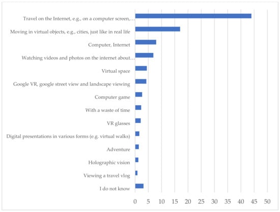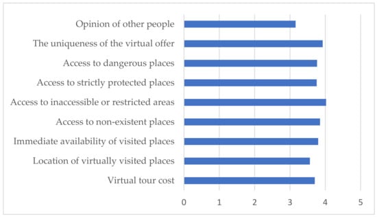 Virtual sightseeing may also constitute an alternative for people who are disabled or sick, and those who cannot undertake the effort of tourist activity or explore the tourist resources of the world on their own. Additionally, VR can act as an alternative source of tourism during crises and pandemics such as COVID-19. We found over 26% of the respondents were satisfied with contemporary tourists’ cognitional needs during the VR sightseeing. However, more than 87% of the respondents believed that VR tourism cannot substitute real-world tourism in the long run. This is what scientific publications by people involved in the issues presented confirm [66,67,68,69,70,71,72,73,74]. However, social media positively and significantly affects the image of a tourism destination, and the attitudes and intentions to visit said destination [75]. In addition, it is worth adding that tourism is one of the economic sectors that have suffered greatly in the COVID-19 pandemic [76]. This fact has also contributed greatly to the popularity of virtual tourism, and will certainly also significantly influence its further popularity in the near future. The use of VR also offers the opportunity to visit locations that are difficult or even impossible to access for most people.