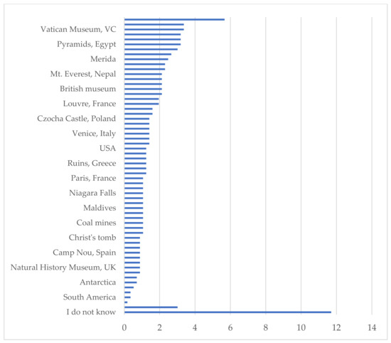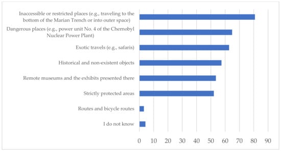 Due to appropriate equipment and software, such a form of tourism makes it possible to relocate to any place in the world, from the Challenger Deep to the summit of Mount Everest, or even further, into outer space, with no need to leave home. There are no obstacles on the way to the Moon or Mars, or millions of kilometers beyond the Solar System and the Milky Way galaxy. Not surprisingly, around 82% of Polish people were aware of VR technology, and 70% of them believed that the new technologies would determine VR tourism development. VR offers the discretion to travel in time, as well as the possibility of traveling to places that do not exist in their original form, but have been reconstructed only in VR. Around 75% of the respondents agreed that VR tourism plays an important role in tourism promotion in Poland, and throughout the world. Moreover, VR and augmented tourism lets us visit fictitious and dangerous, politically restricted, geographically, and economically difficult destinations. For example, our results revealed that most people wanted to experience North Korea, the USA, Antarctica, Syria, etc. At the same time, people recommended the NASA space station as a destination worth visiting using VR and augmented reality. VR tourism will be more beneficial for the people in developing countries who face difficulties in economically, and in attaining visas for developed countries.