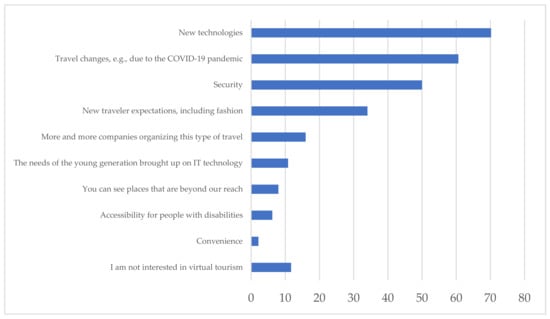 Modern technologies have considerable influence on forming a totally new, non-traditional type of tourism, in which VR and the Internet is the main space of activity [62]. It can be assumed that the development of modern technology determines the outcome of this type of tourism, which has resulted in enormous growth in its importance in recent years. The increasing role of modern technology has caused considerable social-economic changes in tourism [63]. The use of modern tools such as VR is not only a characteristic trend in tourism, but can also be observed in other sectors of the economy [64].
