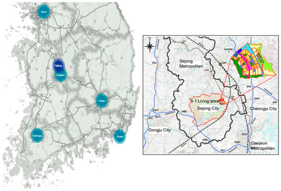 This study’s area of interest is the Sejong 5-1 Living Area smart city, located in the northeast of Sejong City, about 10 km from the Daejeon metropolitan area (Figure 1). The Sejong smart city pilot project covers 2741 km2 and plans to have a population of approximately 19,000 residents and 8000 households [4,5]. The land-use plan consisted of mixed use (31.4%), parks and green space (37.6%), facility land (12.5%), and public infrastructure (18.5%).