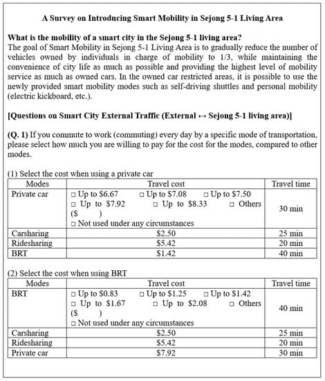 The survey was designed with the goal of creating user-centered smart mobility by identifying user demands and requests through citizen surveys on the introduction of smart mobility. In particular, the survey was conducted to estimate the preference and demand for each transportation mode. It should also be noted that the original survey included both internal trips within the 5-1 Living Area and external trips to/from it. However, this study focuses on external trips because previous studies have focused on mode choice behaviors for smart mobility or short-distance travel, and there has been no research on external trips. In particular, the Sejong 5-1 smart city has the characteristic of introducing the owned car restricted areas to limit private vehicle ownership to about one-third of residents. Therefore, it is very interesting to investigate the effect of the characteristics of smart city transport policy on external travel behaviors. For this purpose, the uniqueness of transport network and policy in the Sejong 5-1 Living Area smart city to be newly built in the future was explained to the survey respondents in advance (Figure 3). Various hypothetical scenarios (i.e., travel time and cost for each mode of transport) were then provided to survey participants to assist them in choosing their travel preferences, having been asked to select the most attractive options in the Sejong smart city. The available external transport modes included BRT, individually owned cars, carsharing, and ridesharing. The travel times for BRT and private car given in the SP survey were decided on the basis of the average external travel times in Sejong City from Korea Transport Database [76], since the two modes are already available in KTDB. The travel times of the carsharing and ridesharing modes in the survey were given as the projected travel times differentiated from the private car and in consideration of operating conditions in the network. As shown in Figure 3, the given travel times for external travel for each mode were fixed as 30 min (car), 25 min (carsharing), 20 min (ridesharing), and 40 min (BRT), while travel costs for all modes were selectively presented. There are various access travel times from very different departure locations, but it is difficult to consider them in the SP survey given limited survey conditions, e.g., a face-to-face interview. Therefore, travel time is understood to be defined as a symbolic concept for differentiation between transport modes regarding operation plan of carsharing and ridesharing modes.