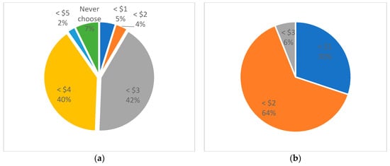 We asked questions about the maximum fare respondents were willing to pay and their preferred travel time per trip under the unique characteristics of transportation policy and hypothetical conditions in a smart city to be built. Because people had different modes of transport depending on their vehicle ownership or driving ability, a different set of questions was presented for different scenarios. The first set of questions was used when driving a private vehicle was not possible for external trips, with two transport modes, BRT and ridesharing, being available in this case. When the ridesharing travel time was 20 min, the fare and travel times of BRT were 1.42 USD and 40 min, respectively, and approximately 42% and 40% of respondents were willing to pay less than 3 and 4 USD, respectively (Figure 4a). The percentages of respondents willing to pay less than 1, 2, and 3 USD for BRT were 30%, 64%, and 6%, respectively (Figure 4b).