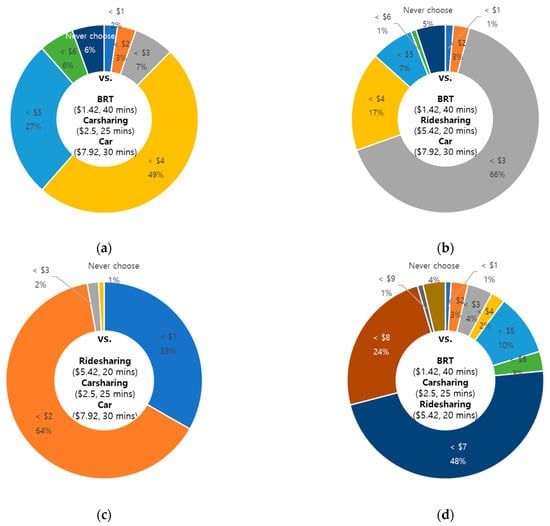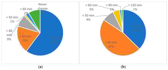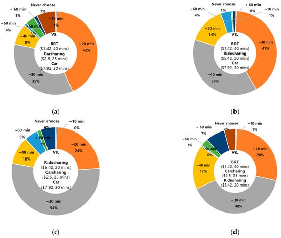 Figure 5 shows the maximum preferred travel time for each transport mode when BRT and ridesharing are available. Given that the travel time and cost of BRT were 40 min and 1.42 USD, respectively, and the travel cost of ridesharing was 5.42 USD, approximately 60% and 19% of respondents chose preferred travel times of 20 min and 30 min for ridesharing, respectively (Figure 5a). Conversely, approximately 37% of respondents preferred up to 30 min for BRT, and approximately 47% of them preferred up to 40 min (Figure 5b).
