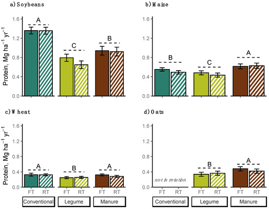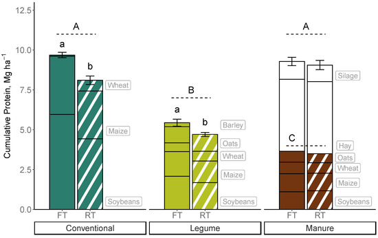 Between tillage treatments, higher cumulative protein production in the FT-CNV system was mostly driven by differences in crop rotations between the FT-CNV and RT-CNV treatments. In the years assessed (2008–2013, 2016–2020), wheat was planted 1–3 times in each RT-CNV plot, but only one time in one of the FT-CNV subplots; substituting wheat for just one year of high-protein soybeans could decrease cumulative protein production by over 1.0 Mg ha−1, more than 10% of total protein production across the 11 years assessed. This crop-rotation effect was even more noticeable in the MNR system, which supported significantly higher grain yields than the LEG system yet produced 30% less cumulative protein from grains. Forage crops more than compensate for this difference, and although people do not consume forages directly, livestock that consume more forages tend to produce higher quality dairy products [100].