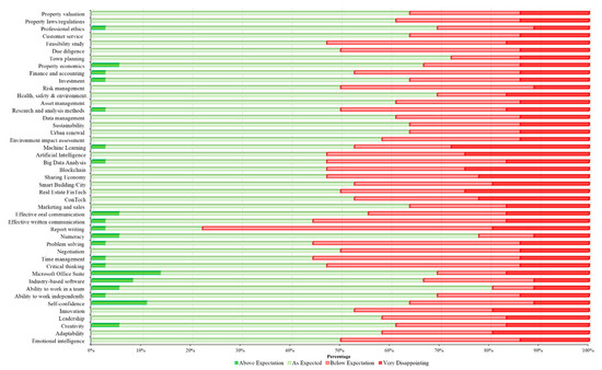 Nevertheless, the property employers were disappointed at the practical performance of property graduates in machine learning (very disappointing by 27.8% of the respondents), artificial intelligence (25.0%), blockchain (25.0%), real estate FinTech (22.2%), conTech (22.2%), sharing economy (22.2%), adaptability (19.4%), innovation (19.4%), report writing (19.4%), smart buildings and cities (19.4%), and town planning (19.4%) (see Figure 2). In short, the property employers were disappointed at the performance of the property graduates in technology-related knowledge and skills. However, these sets were ranked as the least important knowledge and skills for property employers. This also reflects the findings of the study of Galuppo and Worzala [11], in which statistics and technology were rated as the least important. It is worth noting that report writing is one of the most important knowledge areas and skillsets for property employers. Nevertheless, the property employers in this study were not satisfied with the property graduates’ performance.