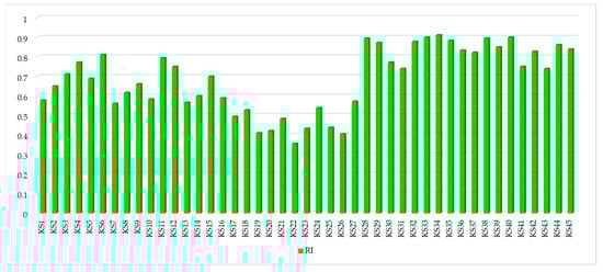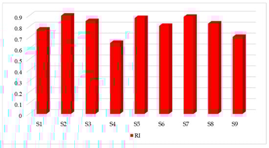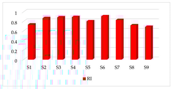 where i and n represent the smallest (1) and largest (5) points in the 5-point Likert scale, respectively. “Frequency” is the number of respondents who provided the ratings, while the “maximum rating” is the highest point that can be given by the respondents—i.e., 5. The RI of respective items will range from 0−1. The higher the RI is, the higher the perceived importance or prevalence of the respective items will be. To facilitate the interpretation of the RI, Akadiri’s [68] five categories of RI were adopted: high ‘0.8 ≤ RI ≤ 1’, high-medium ‘0.6 ≤ RI < 0.8’, medium ‘0.4 ≤ RI < 0.6’, medium-low ‘0.2 ≤ RI < 0.4’, and low/unimportant ‘0 ≤ RI < 0.2’.