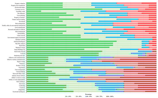 Figure 5 reflects the percentage of the knowledge areas and skills acquired by property graduates while in school. Over 25% of the property graduates indicated that self-confidence, the ability to work in a team, critical thinking, the ability to work independently, time management, report writing, effective written communication, and effective research and analysis methods were strongly encouraged (80–100%) at the university. Specifically, report writing and effective written communication were in the best and third place our of the knowledge areas and skills firmly acquired by the property graduates. This is exceptionally important for property employers too, who ranked report writing and effective written communication as the second and third most important knowledge areas and skills in this study. This finding aligns with that of Galuppo and Worzala [11], Callanan and McCarthy [19], Weinstein and Worzala [14], Poon [33], and Xiao and Chan [4].