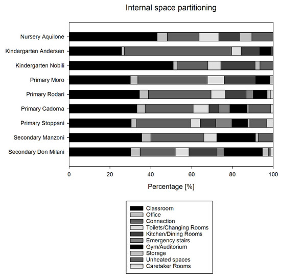The two buildings renovated are Andersen Kindergarten (number 2 in Table 1) and Moro School (number 4 in Table 1). The efficiency measures applied were, respectively, glazing system substitution for Andersen Kindergarten and heating system refurbishment for Moro School. In the first building, the effect of efficiency measures was already visible during year 2014, while in the second building the renovations was more profound and the building was not operated during year 2015 and reopened during 2016. As anticipated, we can analyse the partitioning of internal spaces based on the reported functions in Figure 2 to gain a better understanding of the characteristics of all the buildings considered in this study. All the buildings allocate similar percentages for similar functions, with the exception of Aquilone Nursery and Nobili Kindergarten, which have more space for classrooms.