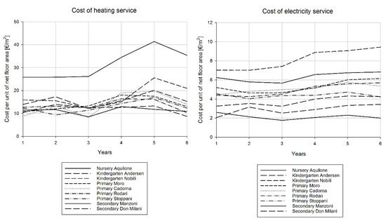 As reported in the introduction, the two fundamental questions are whether it is possible to use variable-base degree-days regression models for the long-term monitoring of energy services cost and what is the goodness of fit that they can achieve using monthly utility billing data, frequently available in digital format. First of all, we report the ranges of cost for heating and electricity services for all the buildings, from year 1 to year 6 (2009–2014). The cost of heating service is much larger and generally much more variable (due to weather dependence) than the one for electricity as can be seen in Figure 3.