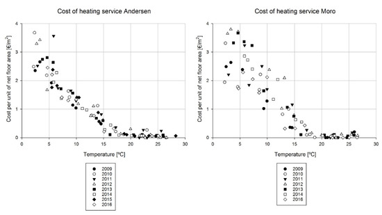 Correlation between monthly costs of heating service per unit of net floor area and average outdoor air temperature—Andersen Kindergarten and Moro School.