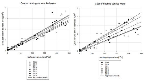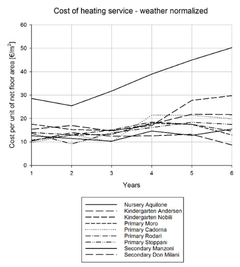 In this Section we use the same methodological approach employed before for the weather normalization of heating service cost for Andersen Kindergarten and Moro (presented in Section 5.1), but we apply it to the all the building considered in the study for the first 6 years of monitoring (2009–2014).