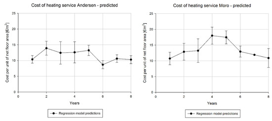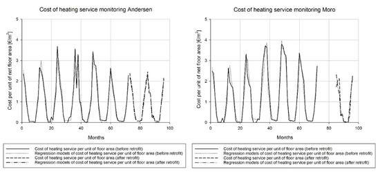 On the other hand, in the second building (Moro School) the goodness of fit achieved by the models (R2 in the range 86.3–97.5%, Adj-R2 84.9–97.3%) is high as well, but the uncertainty in the prediction of cost on a yearly base is much larger, despite having similar values, as expected due to the larger spread of data already highlighted in the previous steps of the analysis. The results of the regression predictions are then plotted in time (monthly intervals) in Figure 6 for the entire monitoring period (96 months) for both buildings; the Moro building was not in operation in 2015.