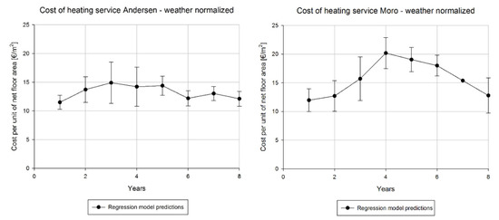 Yearly costs of heating service per unit of net floor area—Weather normalized model predictions—Andersen Kindergarten and Moro School.