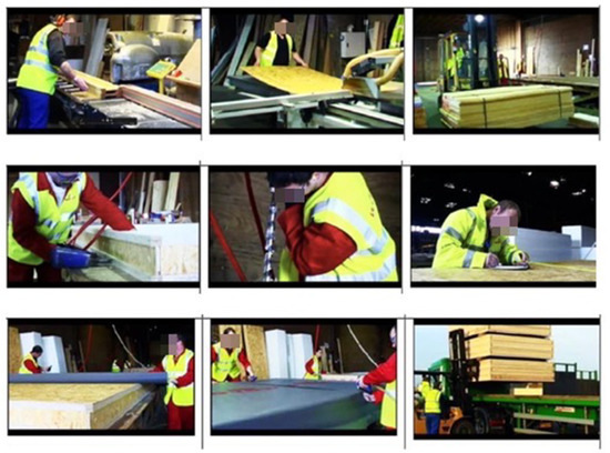 Prefabricated house construction systems produced in large factories have become more prevalent over the last 20 years. Such systems include both open and closed panel timber frames. They can incorporate composite systems, fully fitted out assemblies, and complete volumetric systems, which are increasingly commonplace. Figure 1 shows images of the assembly process of the WAVE Homes [9] closed panel timber frame factory that our early closed panel research [7] was a precursor to. It addressed some of the production issues that we had experienced and represented an improvement in the processes and quality of completed product.