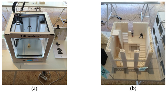 (a) Amsterdam 3D printed house, based on a Canal House design: modelling of concept using a small 3D printer; (b) scale model of 3D printed house.