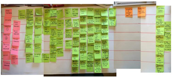 We chose to use the technique of Visual Mapping [9] to initiate the design process. This is a technique used to visualise the production of new or modified products or workflows. We planned to work with stakeholders from different backgrounds, and visual mapping had the advantage of effectively providing a common language among these stakeholders. This technique can appropriately be part of a Lean approach to achieving efficiency and value [17]. Many industry sectors have benefitted from the introduction of Lean ideas [18] into their processes, and several authors have reported on such adoption as a part of the most current timber panel prefabrication process [19,20]. Lean thinking dictates that systems and processes must be managed effectively, and that activities must be linked and accurately identified in order to create the necessary order in which to produce specific products. The aim is to facilitate a seamless flow and allow further analysis to enable continued improvement [11]. In order for this to be achieved, one of the first steps in the development of a system is to construct a Value Stream Map (VSM). Figure 5 shows the first stage of the Value Stream mapping process that we used to set the framework for the mobile timber panel-making unit.
