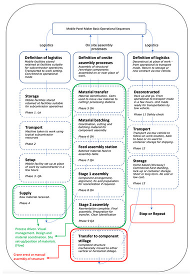 The operational steps that were envisaged are shown in Figure 6 and were developed from manufacturing processes rather than more traditional site-based operations or trade demarcations. There were deliberately no trade skills delineated in the steps of the process. The process was driven by a need to create the consistent flow noted as essential by Bicheno [17] in achieving a Lean operation.