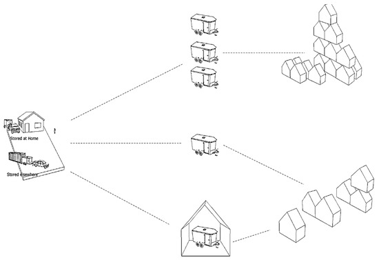 Several iterations of the process were advanced concerning raw material flow into the unit and the removal of assembled components from it. Site access, storage, and space to undertake tasks were estimated. The process shown below (Figure 19) was selected on the basis that it had clearly differentiated points of access and exit, similar in most respects to ideal small building sites and temporary warehouse facilities.
