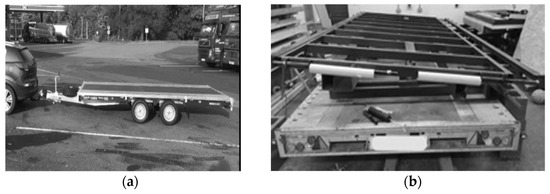 (a) Commercially available flatbed trailer with towing undertaken by a domestic SUV, van or 4X4; (b) tilting table sub-chassis fixed to top of flatbed.